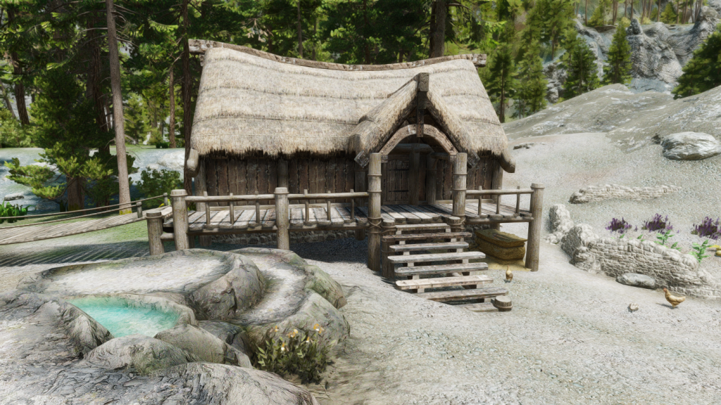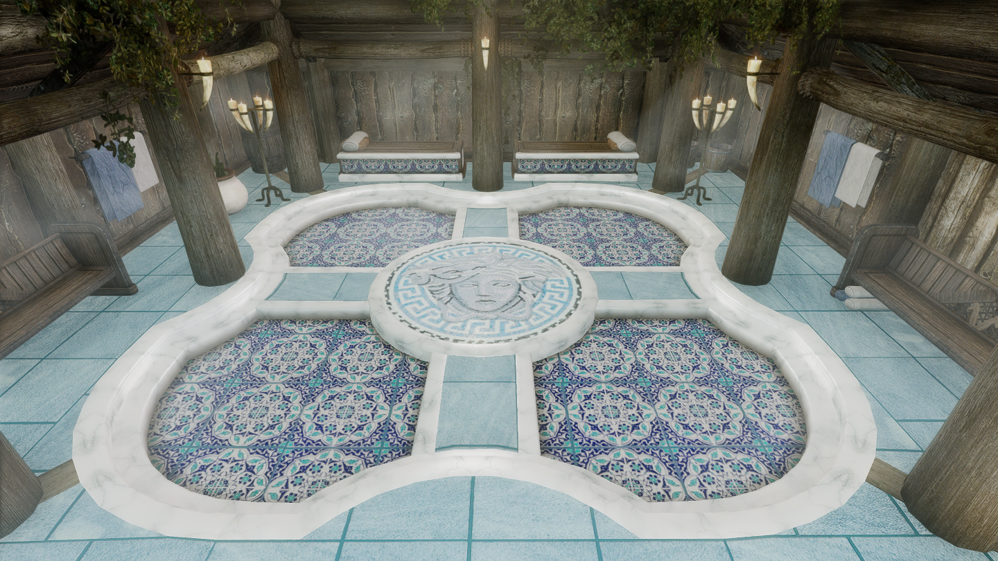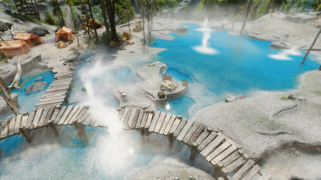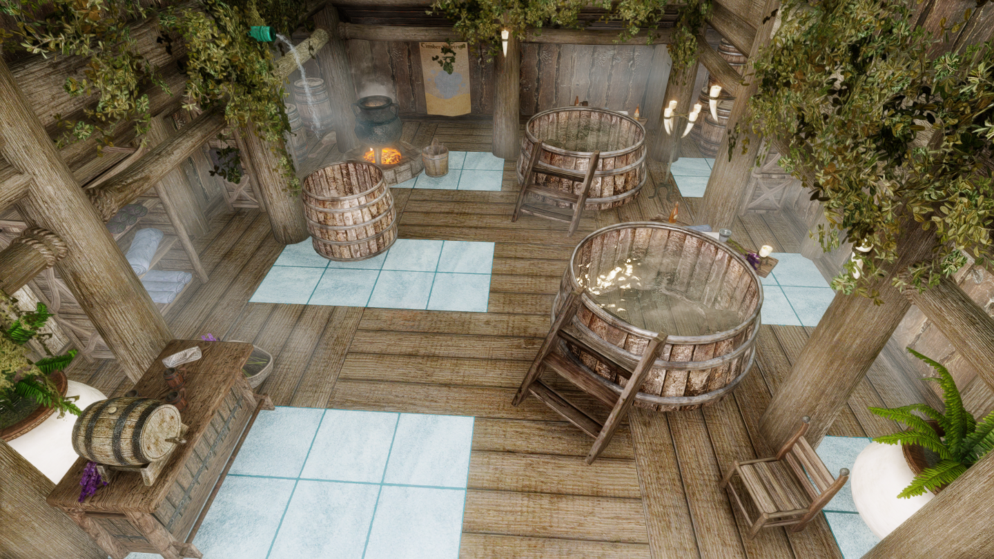イーストマーチのダークウォーター・クロッシング近くの温泉地帯に、宿屋やNPCなどを追加するMODです。屋内浴場も追加されています。