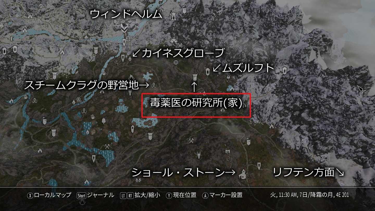 MOD導入直後はマップマーカーは黒いので、初回は現地へ向かう必要があります。イーストマーチの東側、ムズルフトの近くにあります。