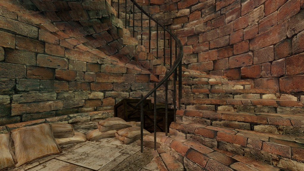 屋上と繋がっている梯子がある他、螺旋階段を下りたところにベッドロールが置かれています。