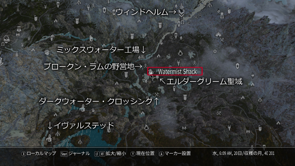 MOD導入直後はマップマーカーが黒いので、初回は現地へ向かう必要があります。家はブロークン・ラムの野営地とエルダーグリーム聖域の中間辺りです。