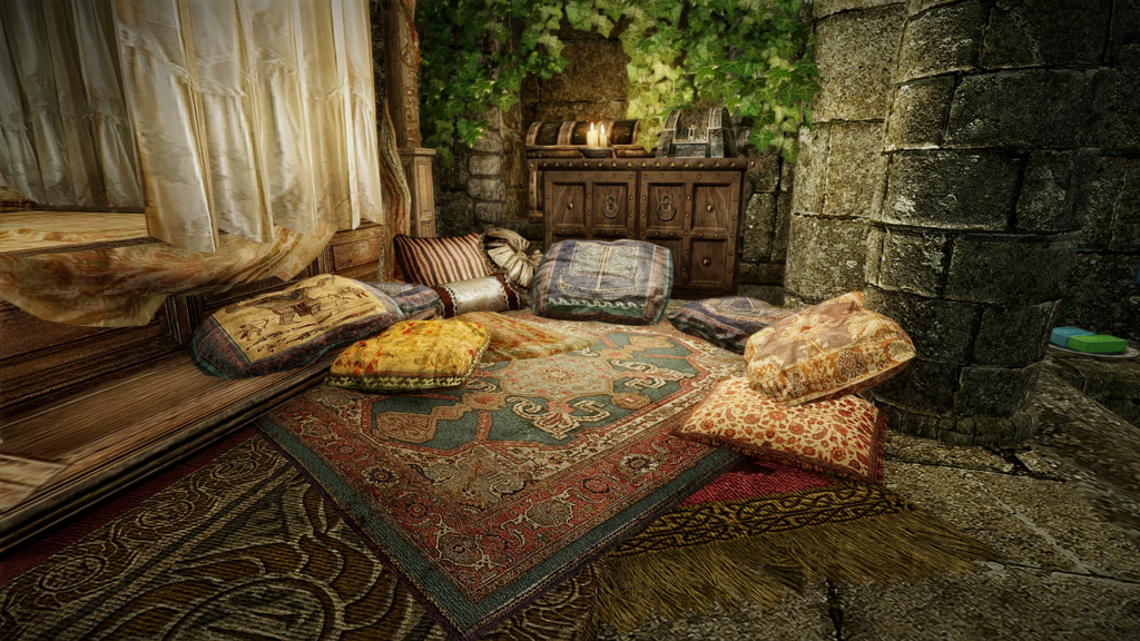 この部屋に限らず、NPC固有のマーカーを使用できるMODを入れていると、プレイヤーもNPCたちのように寛いだりすることができます。
