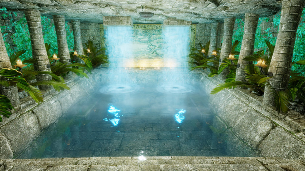天蓋付きのおしゃれなベッドやプールがある部屋です。クッションやプール周辺で従者たちが座っているのもよく見かけました。