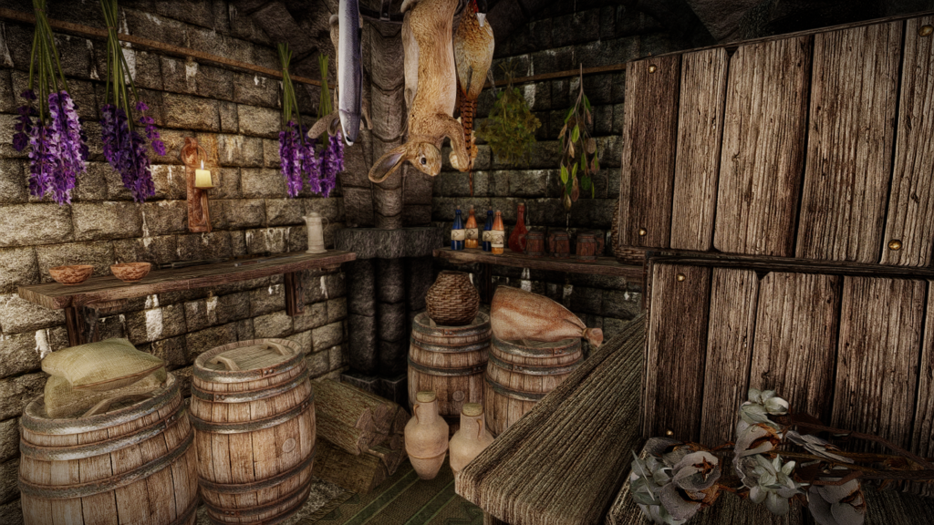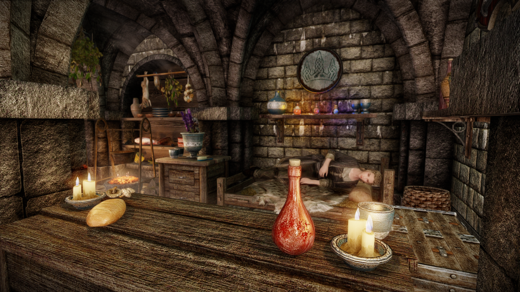 屋内にはいろんな飲食物が置いてあり、その中にはこのMODオリジナルのスノーベリーブランデーもあります。スタミナ回復速度と引き換えに、炎・雷撃・冷気ダメージ耐性を上げる効果があるようです。商人NPCから購入したり、その辺りで盗んだりして入手可能です。