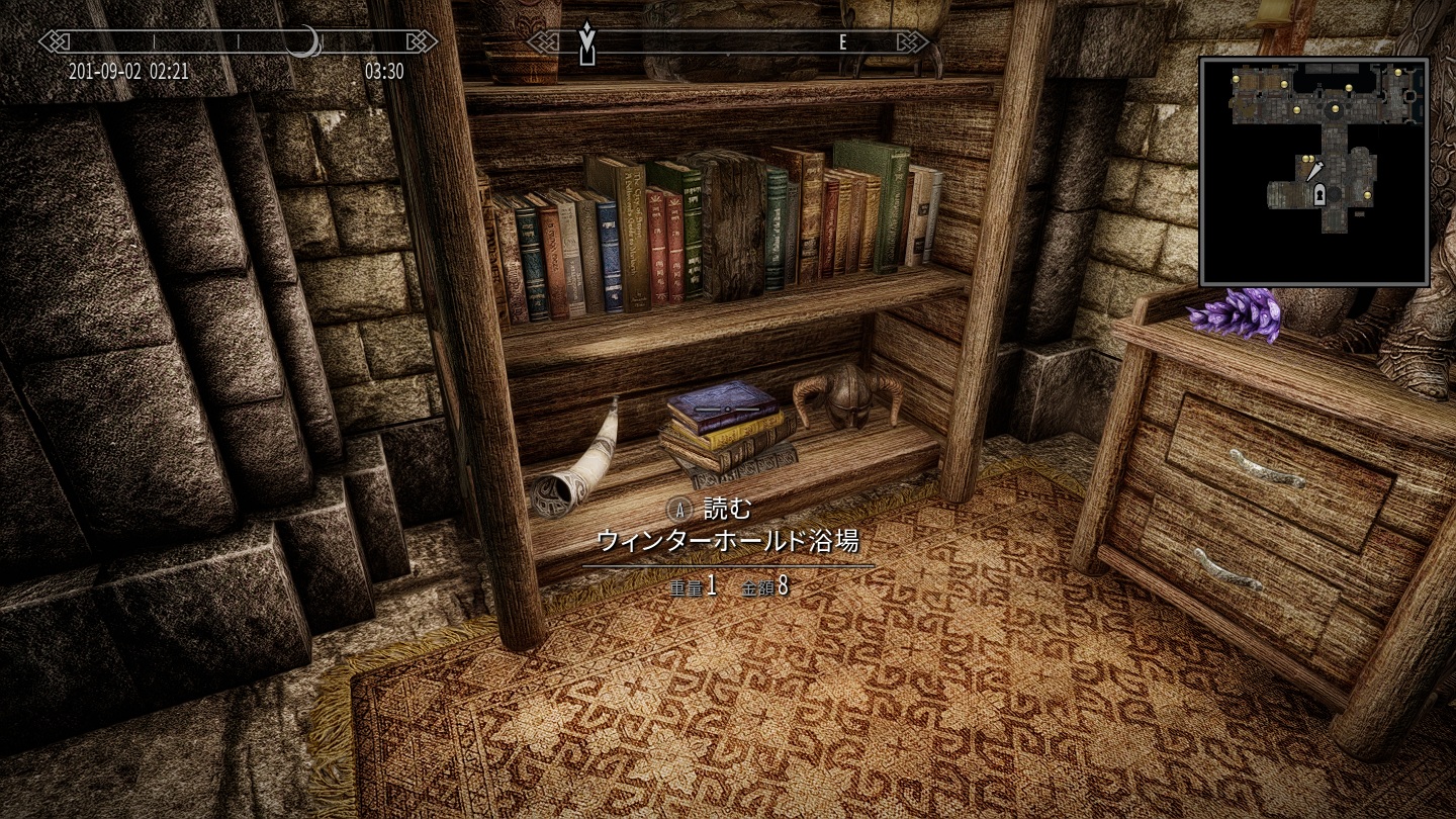 屋内にはいろんな飲食物が置いてあり、その中にはこのMODオリジナルのスノーベリーブランデーもあります。スタミナ回復速度と引き換えに、炎・雷撃・冷気ダメージ耐性を上げる効果があるようです。商人NPCから購入したり、その辺りで盗んだりして入手可能です。