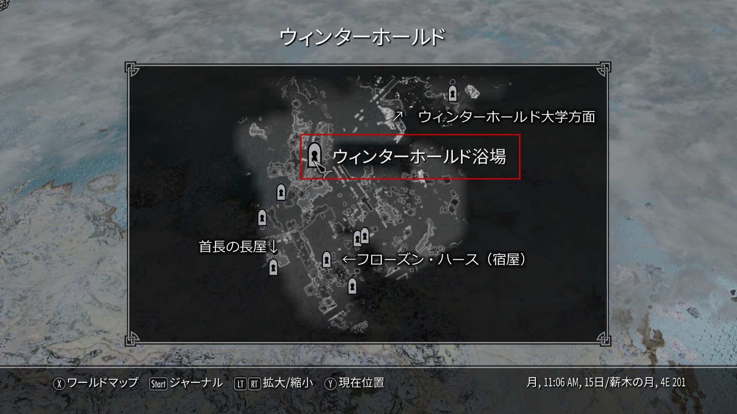 ウィンターホールド大学へ繋がる道(ファラルダさんが入学試験を行うところ)の橋脚に入口が追加されるタイプです。入浴系MODやほとんどの街・大学の改変MODと併用しても互換性に問題はなかったり、互換パッチが用意されていたりします。