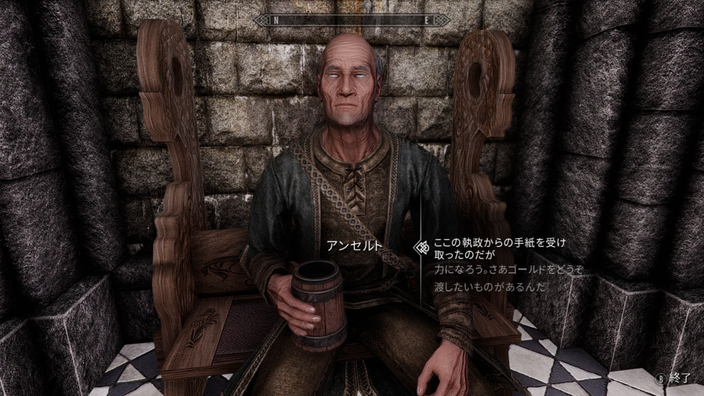 裏門近くの入口から出入口広間に入り、頭にクエストマーカーが付いた執政のアンセルトに話しかけます。バニラで各地域の執政から家を購入する時と大体同じような会話の流れになっています。