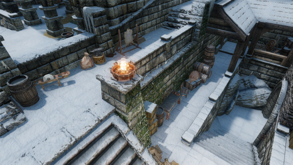 - 正門側:溶鉱炉/作業台/砥石/皮なめしの棚/厩舎