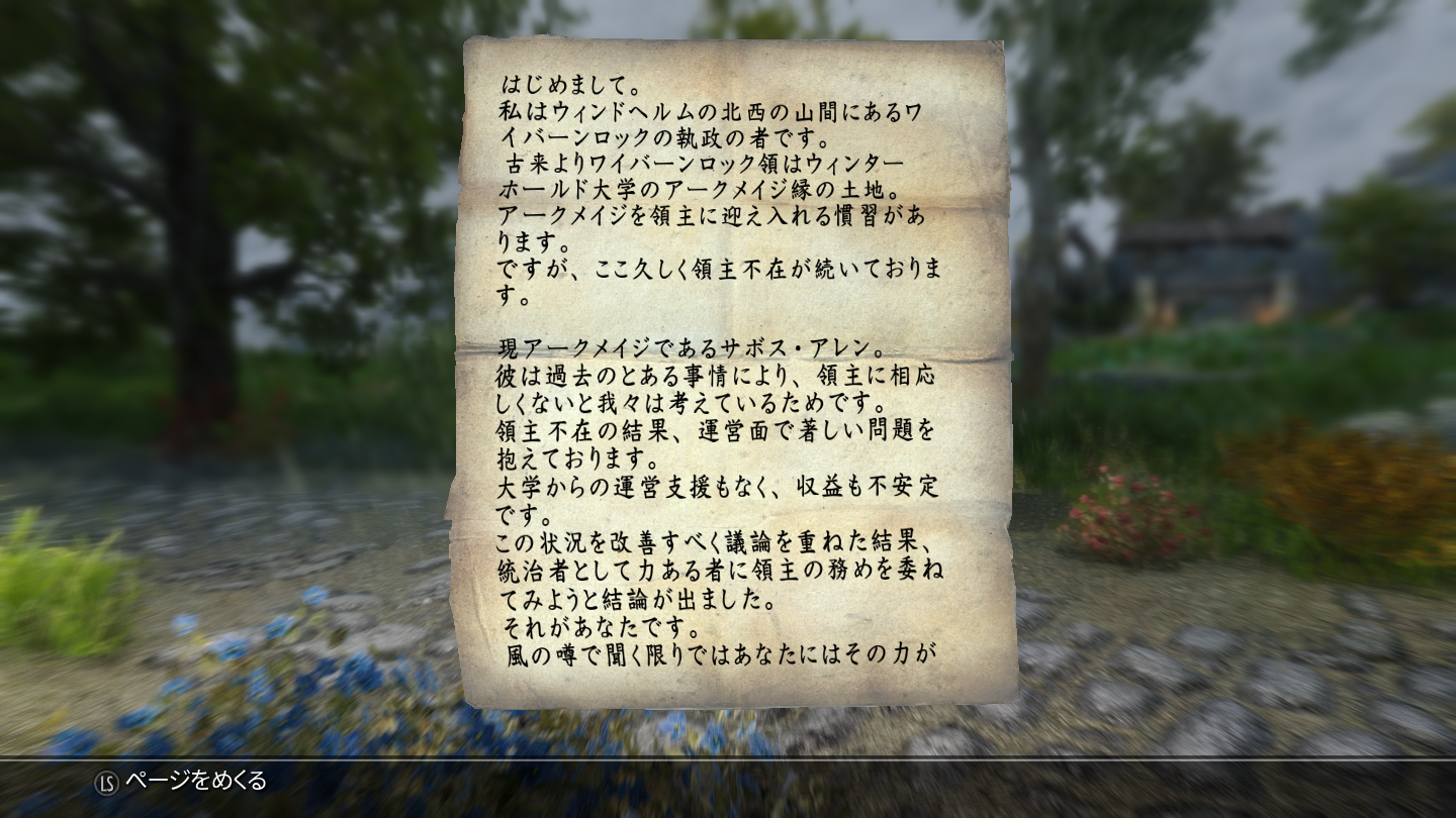 こちらのMODを導入後、インベントリに手紙が追加され、導入クエスト「ペイル峠の眺め」が始まります。