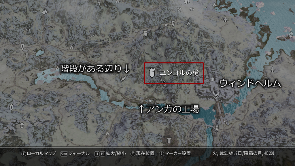 家の西側に入口と繋がる階段ができています。徒歩で向かう際は、ウィンドヘルムの西側にあるアンガの工場近くの坂を上り、この辺りへ。