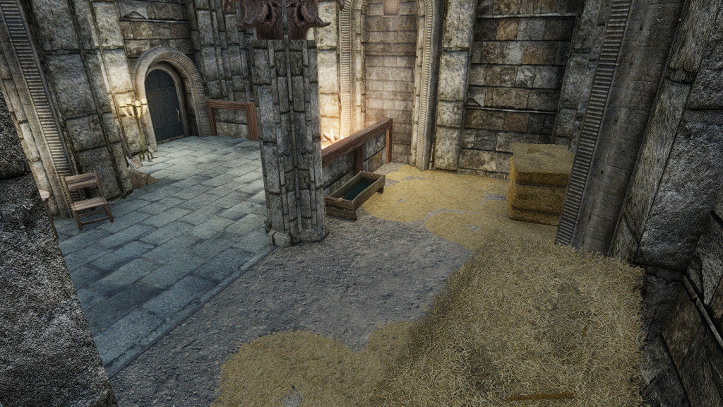 落とし格子から入ってきたところを屋外としています。厩や鶏、トレーニングダミーなど。