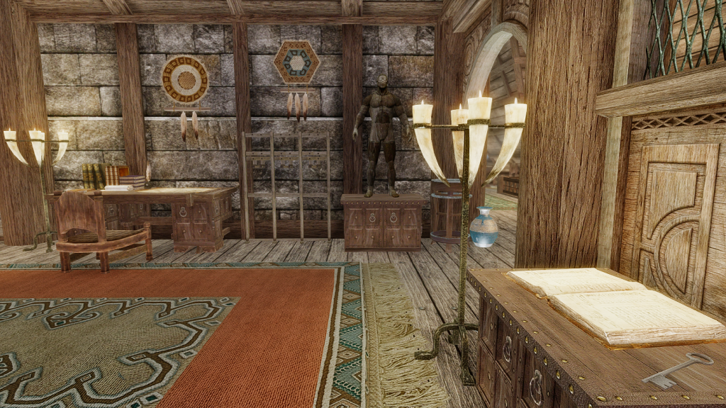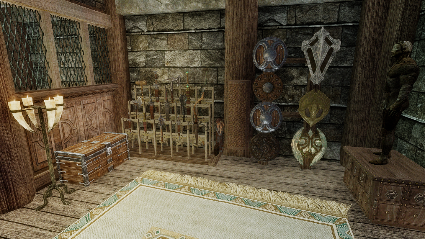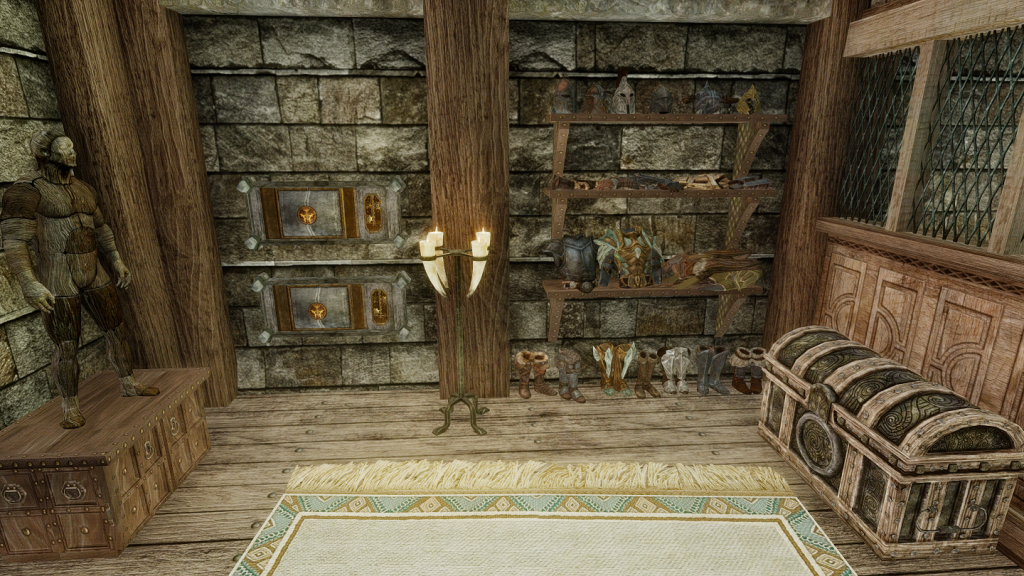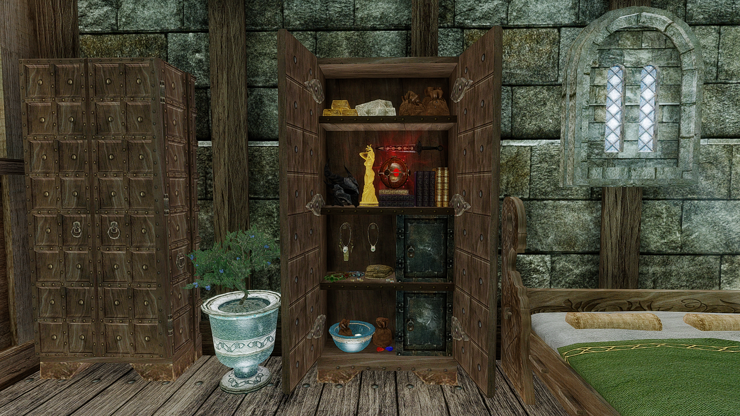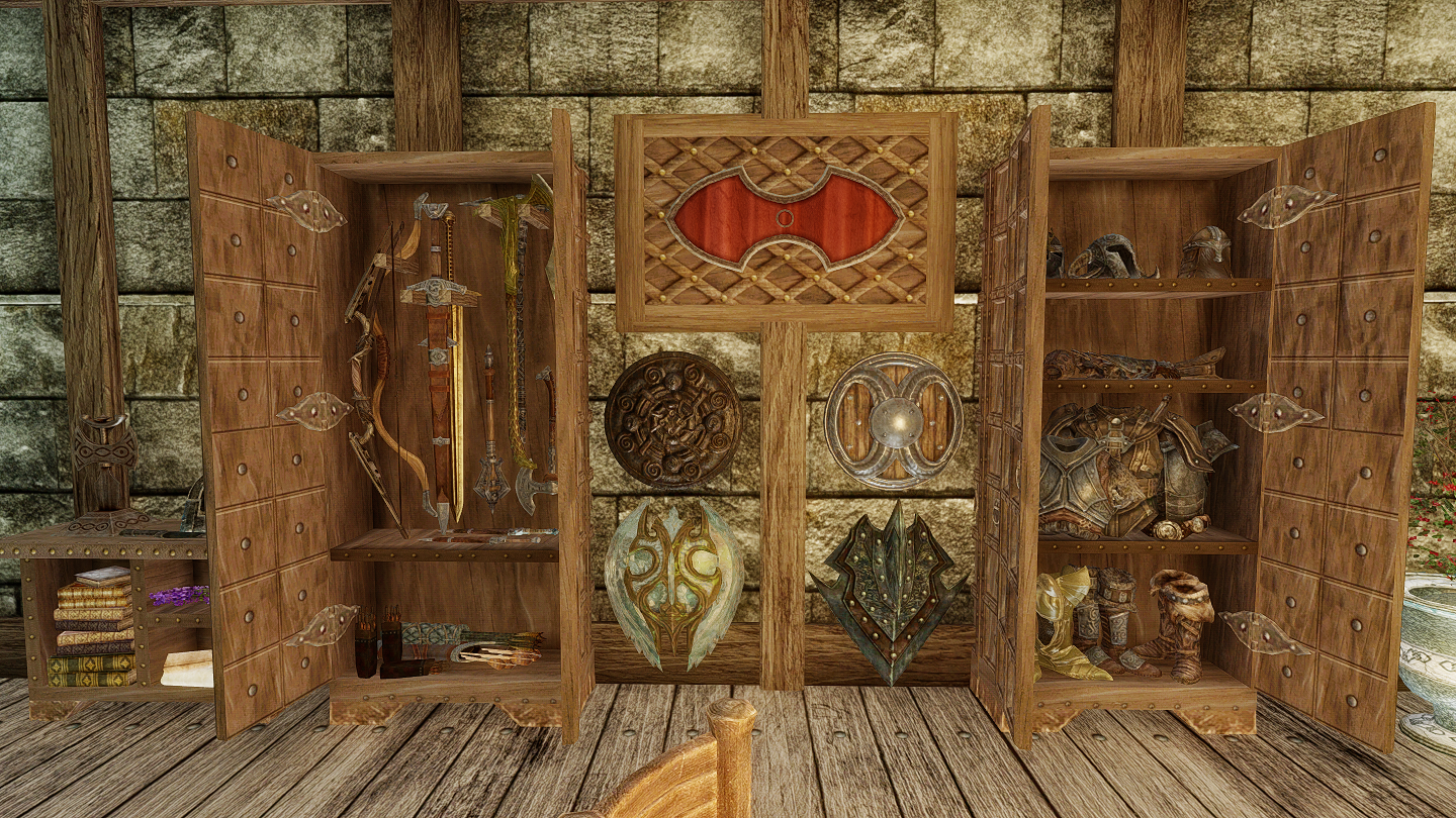 武器や盾、防具など、3階の主寝室のキャビネットとリンクしている収納スペースもあります。