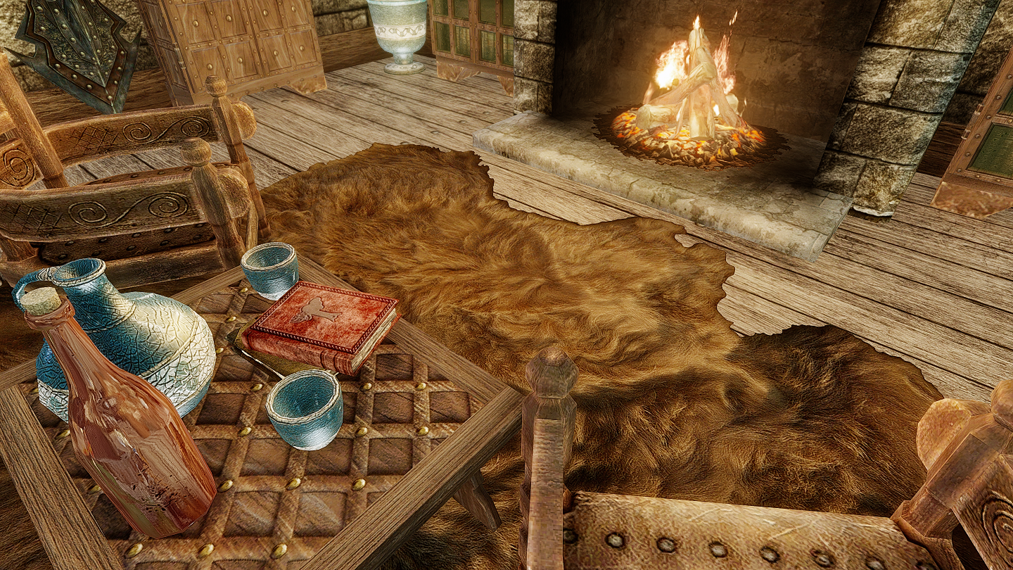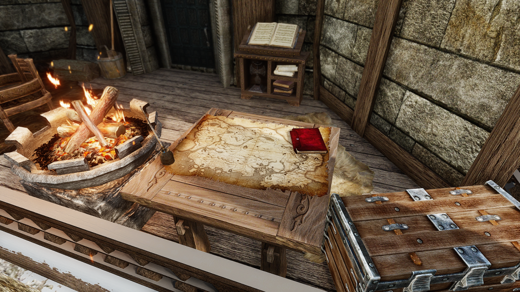 暖炉前のテーブルにはこの家にテレポートできる呪文の書も置かれています。熟練者レベルの変性魔法でした。