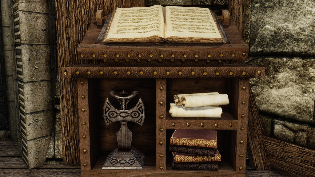 バルコニー内の階段を降り、扉を開けた先に専用のテラスがあります。書見台のところにはタロスの祠が。